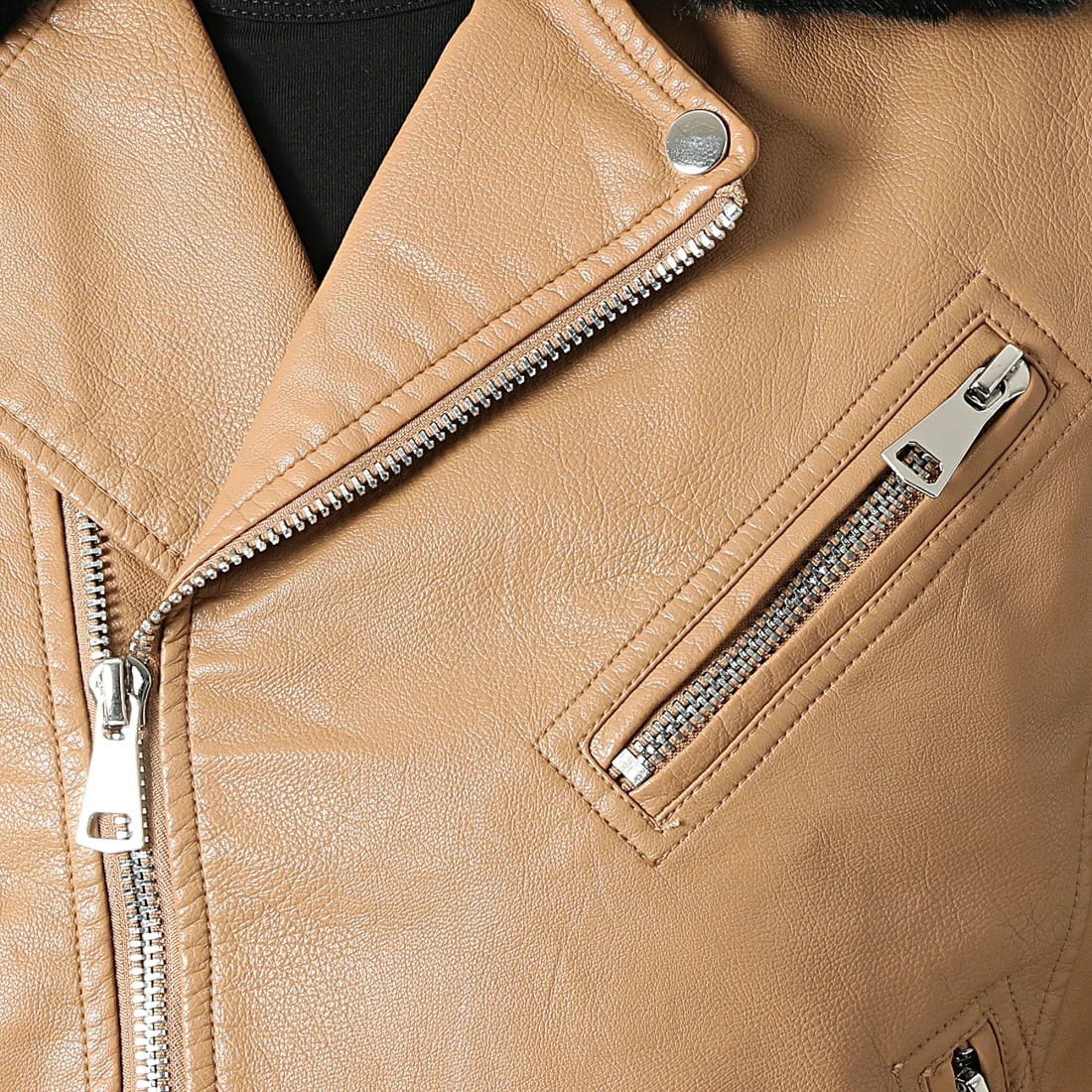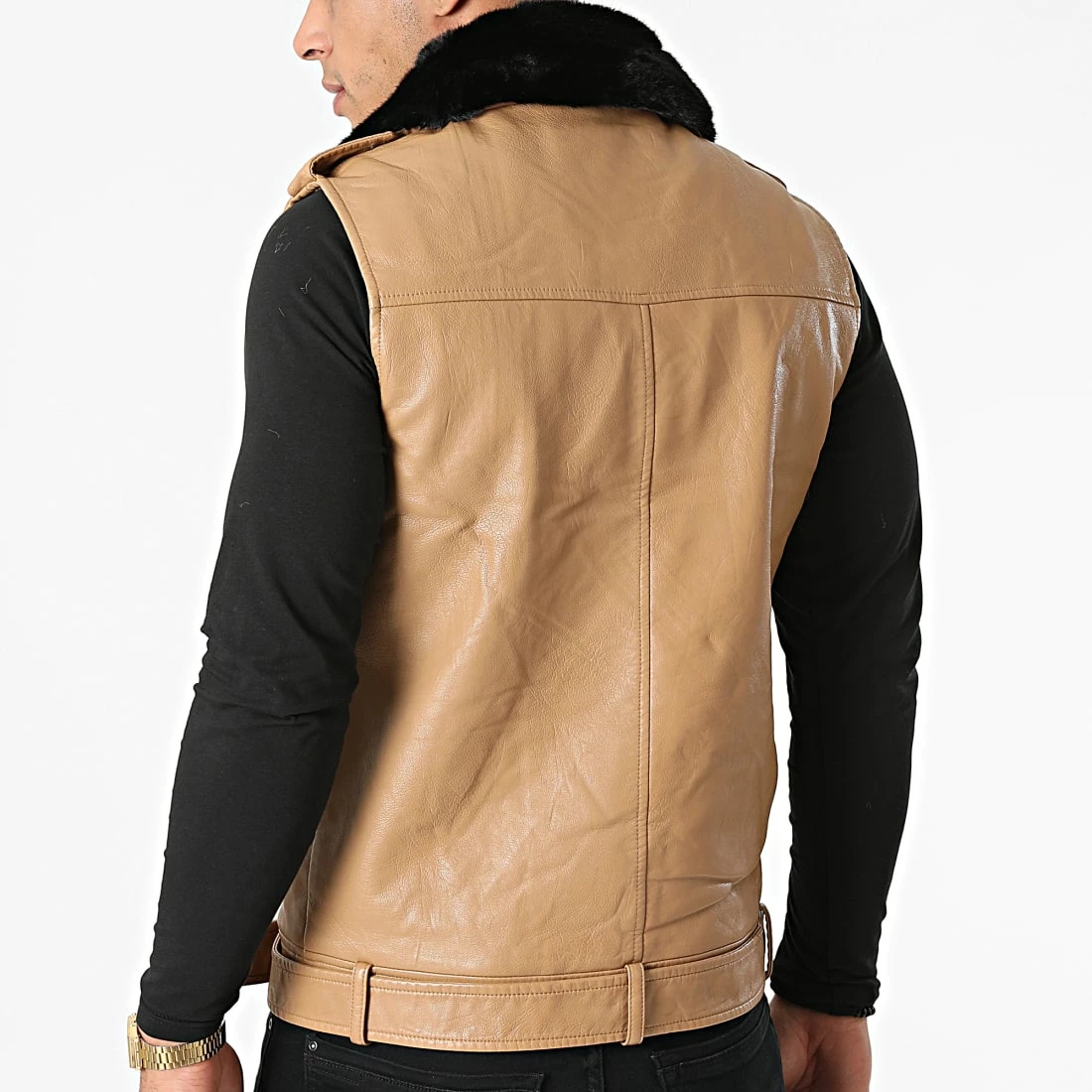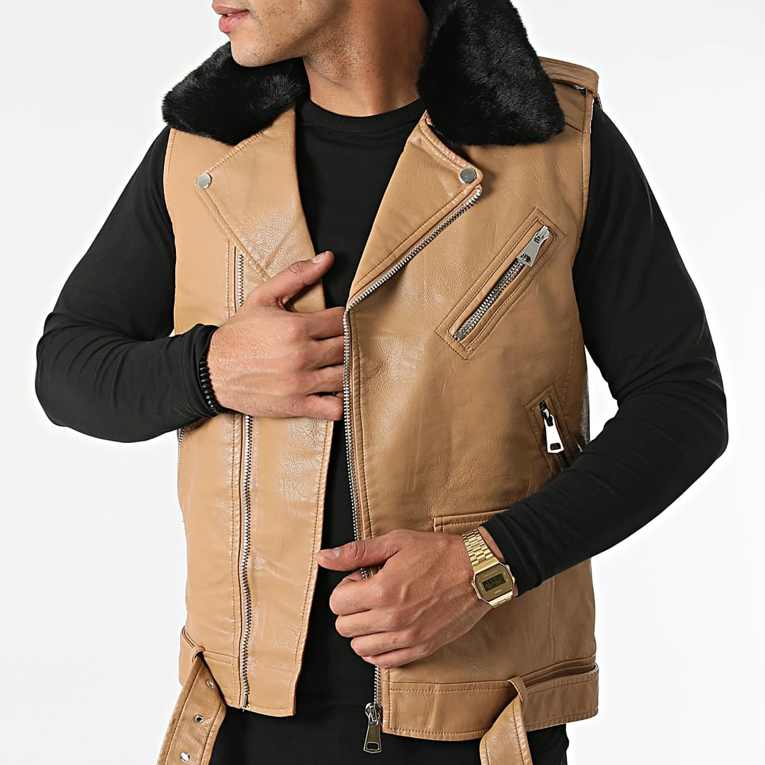 • Veste biker aspect cuir sans manches avec col en fourrure synthétique amovible